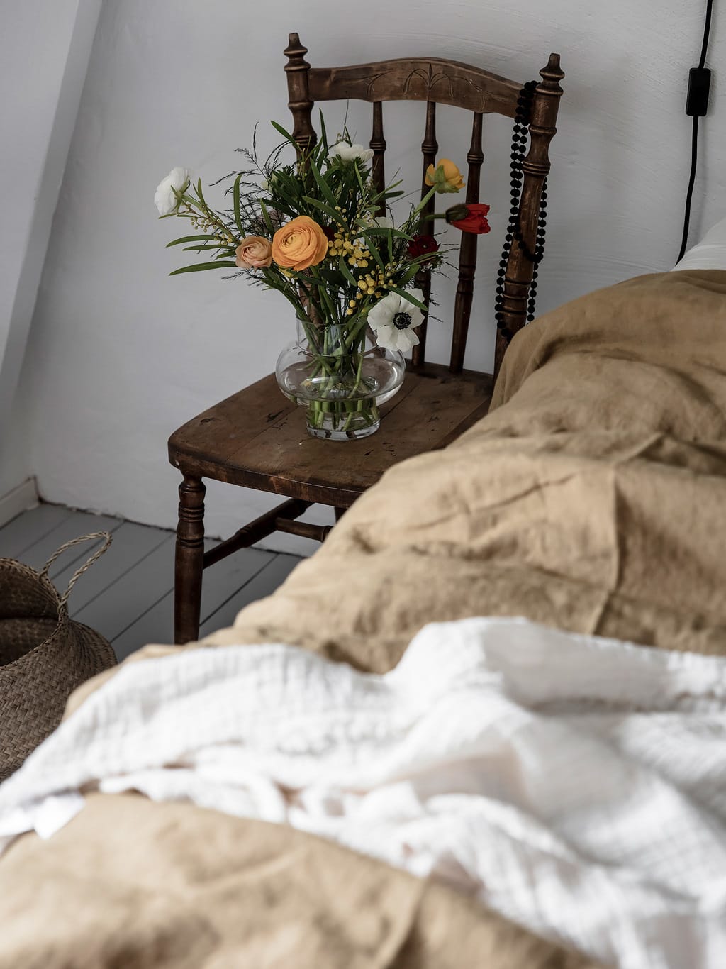 The faded mustard yellow bedsheets work very well in this look and I like the flowers on the antique chair for a great finishing touch.