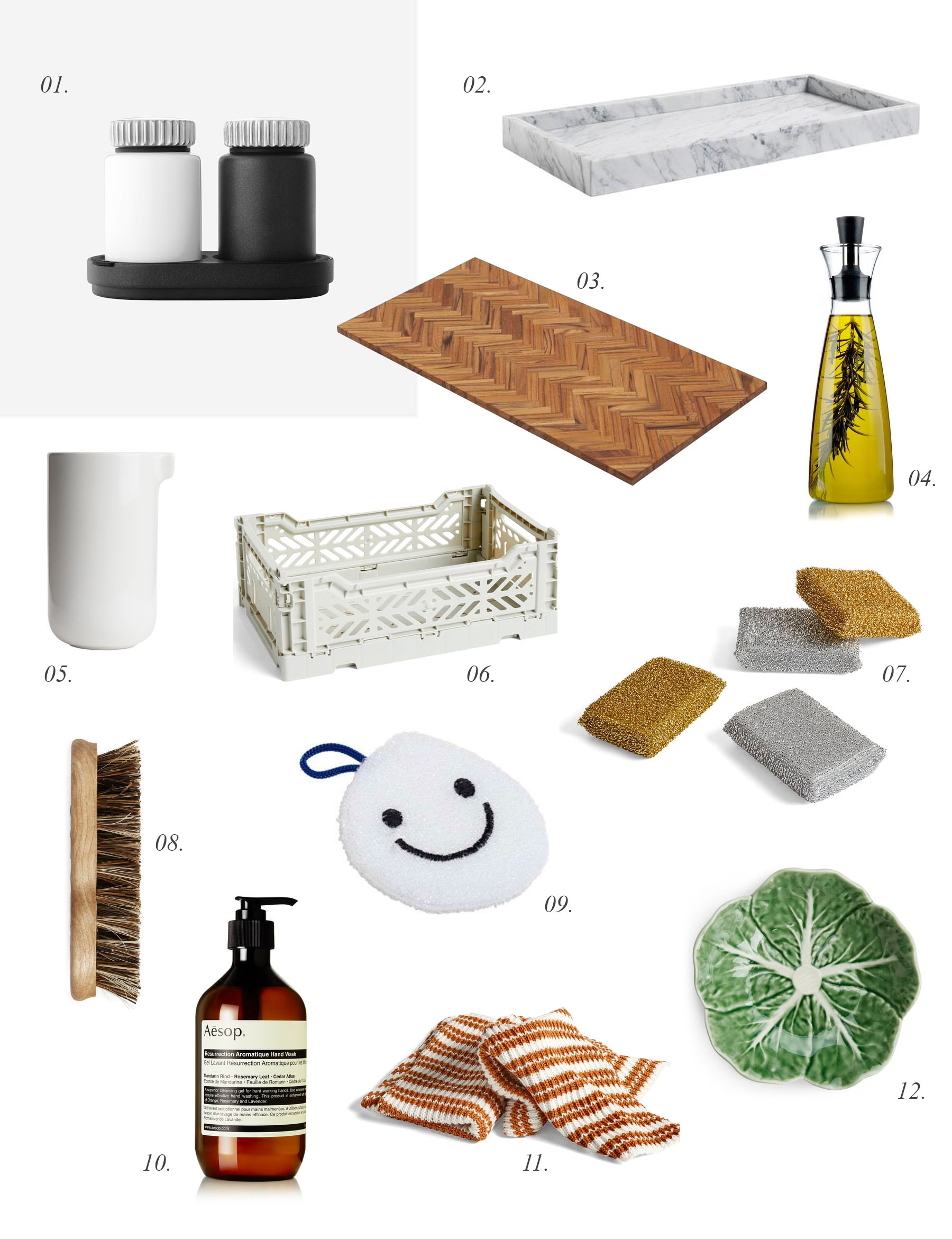 I also bought some fun cleaning supplies like the HAY smiley face sponge and am keeping a crate* next to the sink to keep cleaning supplies together. Next to the stove, I placed a mixing jug from Arket* which is keeping all my utensils close by and I love those little green Bordallo cabbage bowls* for keeping my soap at the sink and for keeping garlic. I now have two of them but will get some more for my kitchen cabinet as well.