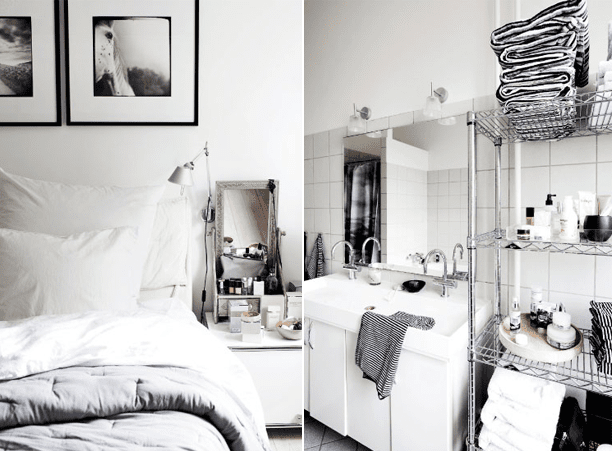 Jordane Arrivetz is an interior designer who finds her inspiration from different aspects of the design culture, especially the 50s and 60s. The apartment she styled combines modern, clean lines, like the kitchen counter and bathroom, with vintage elements like the old ladder in the kitchen and the frames in the living room. I think both are very well combined and give the apartment character and personality.